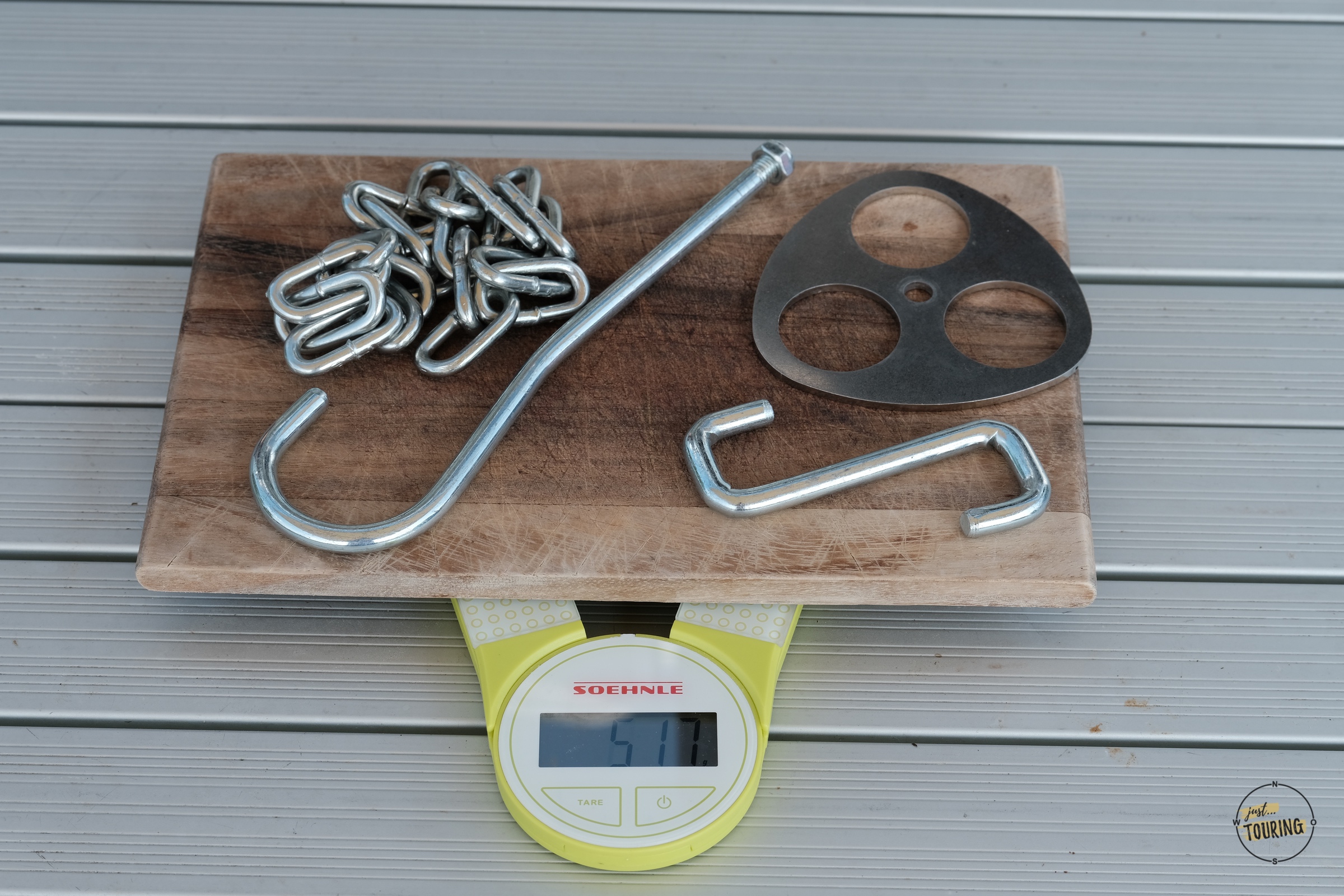 Es ist super simpel und mit etwas über 500g ist auch das Gewicht absolut vertretbar für uns. Bei uns findet die Platte, der Haken und die Kette in einem Ledersäckchen Platz und ist ab jetzt fester Bestandteil unserer Ausrüstung – also immer mit dabei. Und mit knapp 20 Euro finden wir es durchaus preiswert.