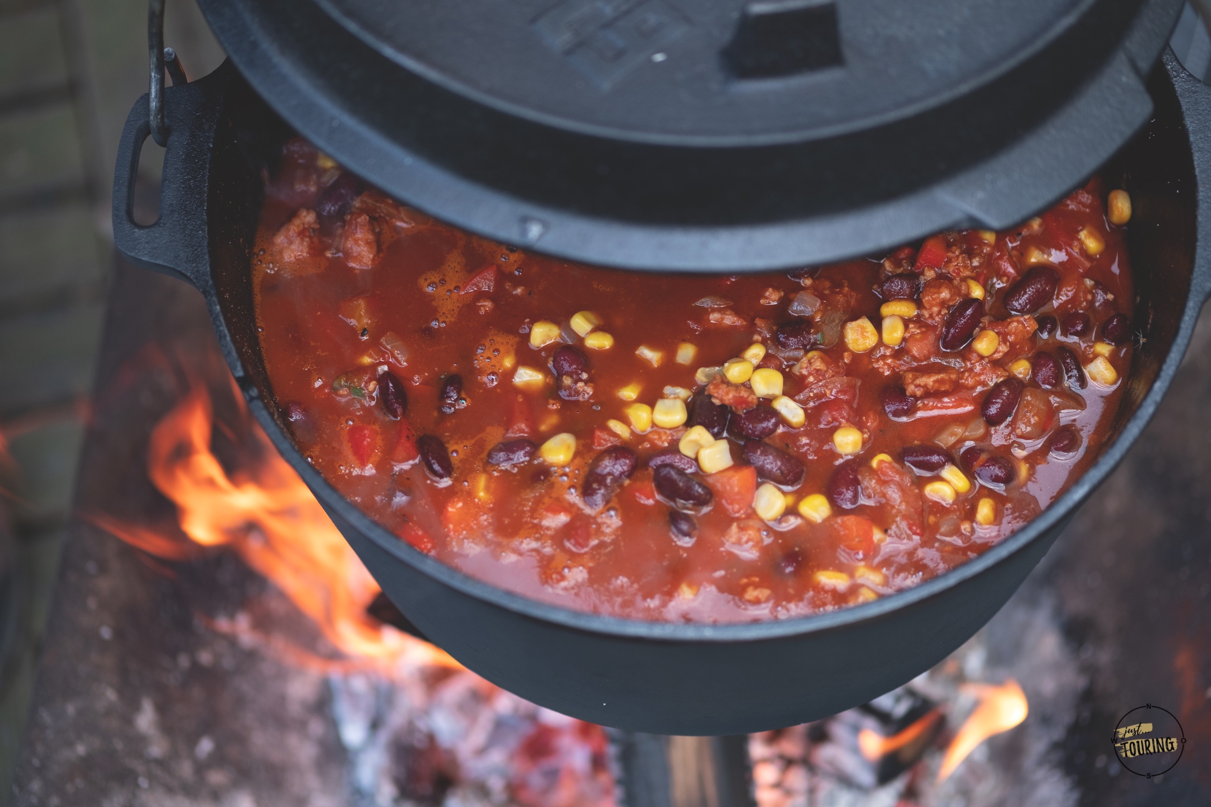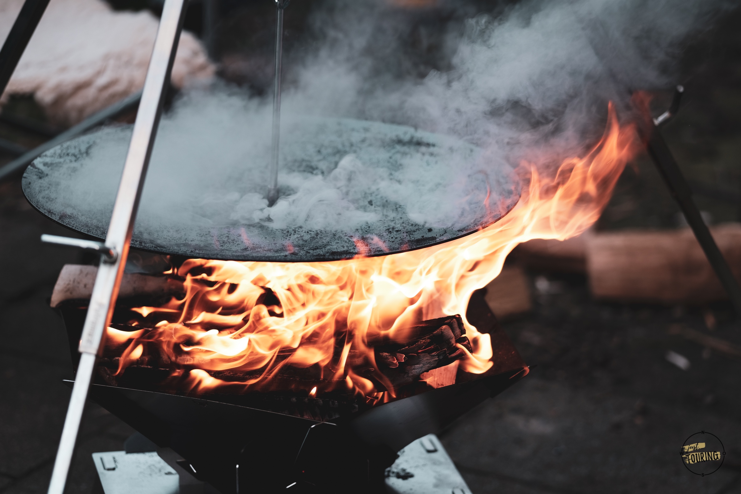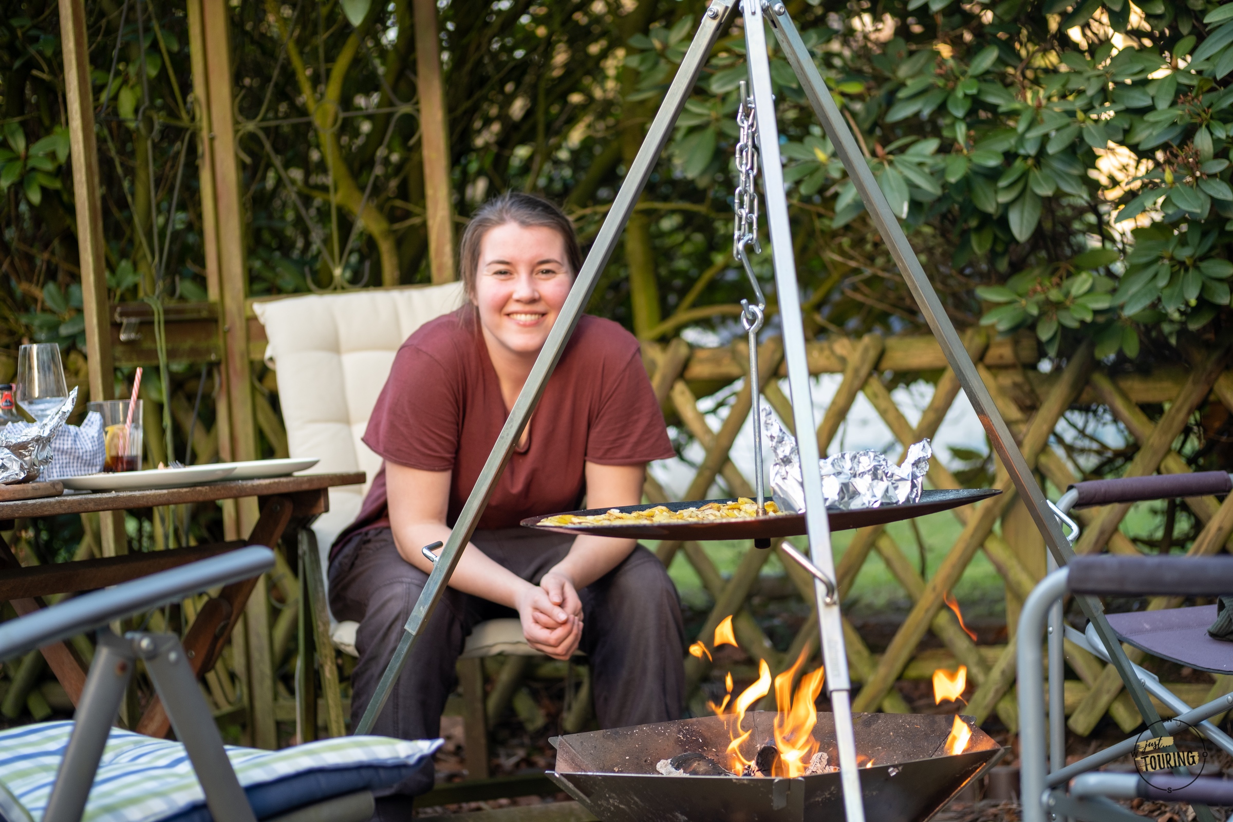 Einen Dutch Oven drangehängt und darin gemütlich ein Chili köcheln lassen oder Bratkartoffeln mit Pimientos de Padrón (Bratpaprika) auf einer Feuerschale zubereitet, die ebenfalls am Dreibein aufgehängt wird. Wahlweise kann man natürlich auch einfach ganz klassisch ein Grillrost dranhängen und grillen.