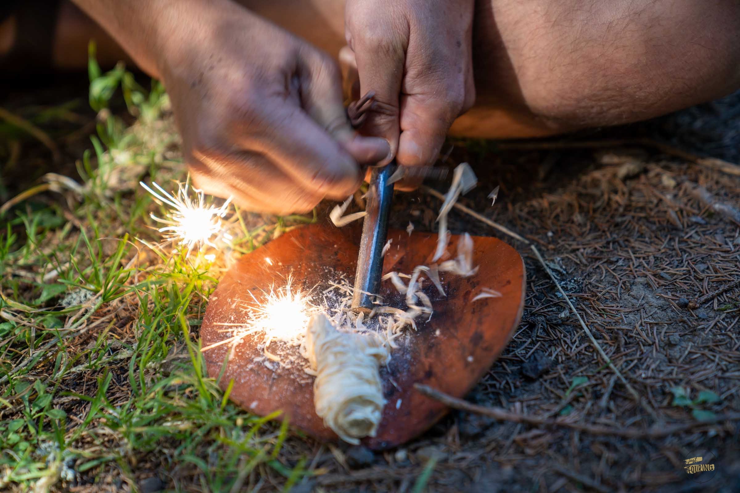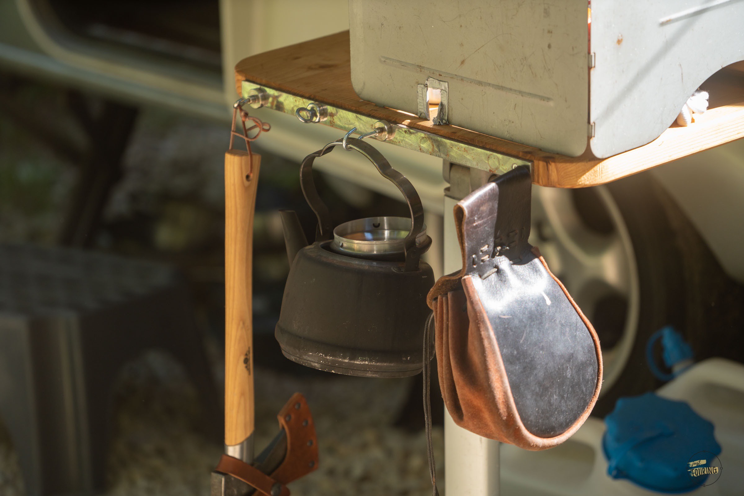 Ich (Markus) bin ein bekennendes Spielkind und habe eine groรe Freude an kleinen Dingen, die meine Phantasie beflรผgeln. Das kann zum Beispiel ein Stรผck Leder sein, um eine heiรe Pfanne vom Feuer nehmen zu kรถnnen oder aber ein einfacher Abspannhaken. Auf dieser Tour kochen wir fast tรคglich รผber Feuer und das Feuer muss ja in Gang gebracht werden: Also Zunderbeutel auf, Feuerstahl raus und mit den Funken die erste Flamme in den Zunder locken. Da habe ich meine Welt direkt im Dรถschen und sobald das Wasser fรผr den Morgenkaffe kocht, kann der Tag kommen.