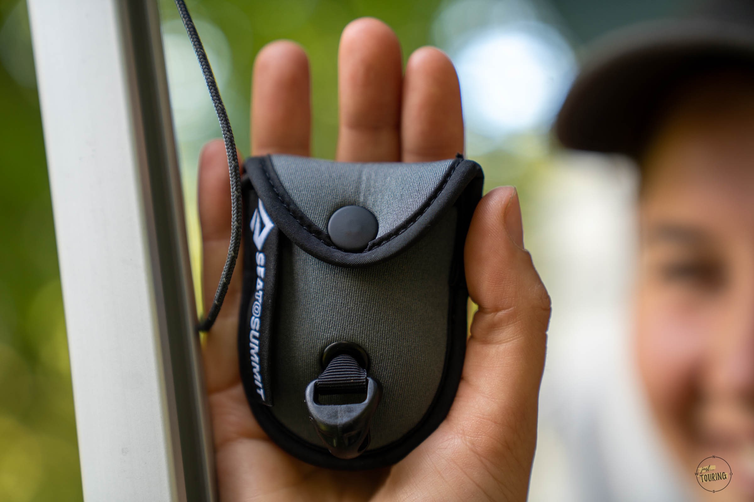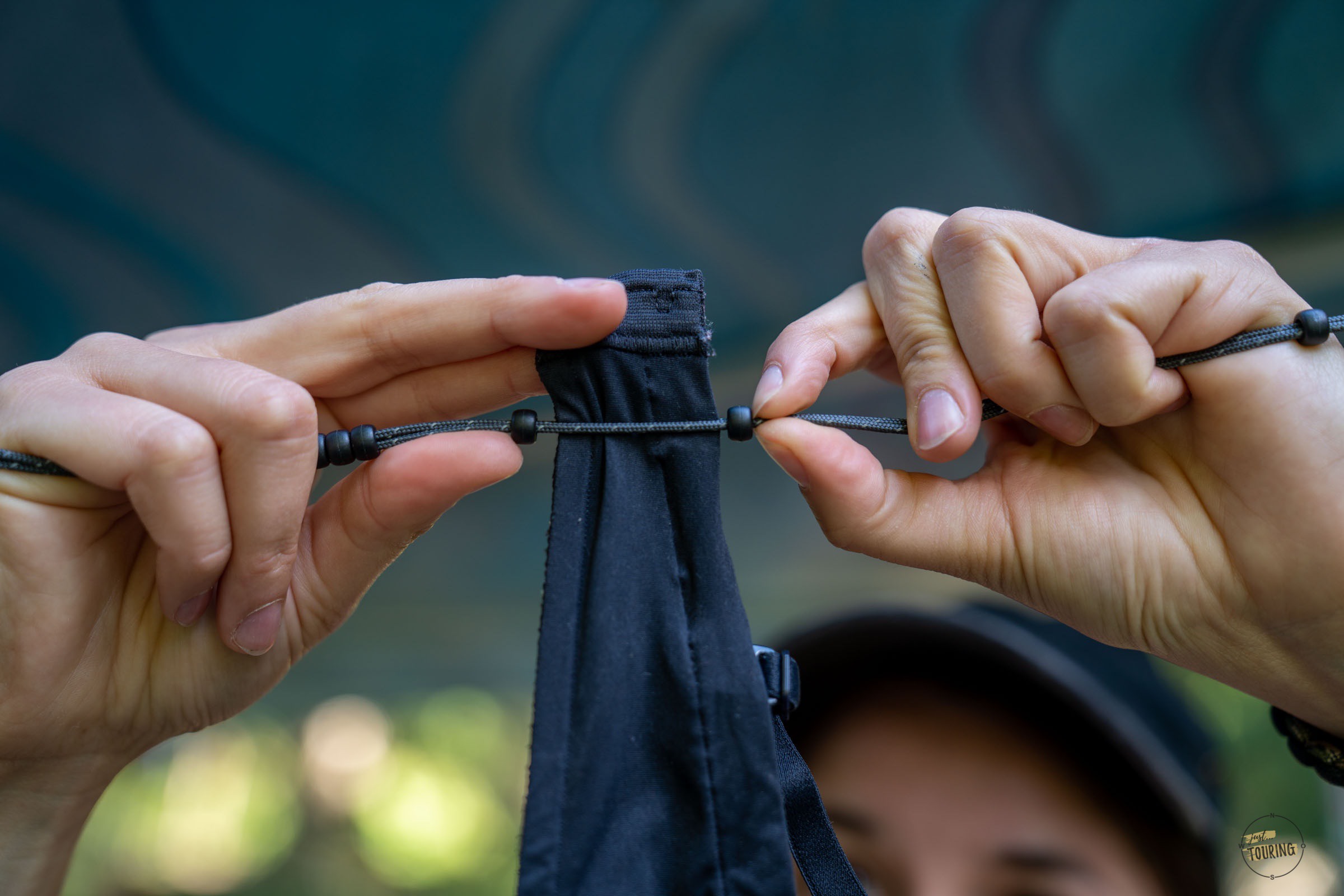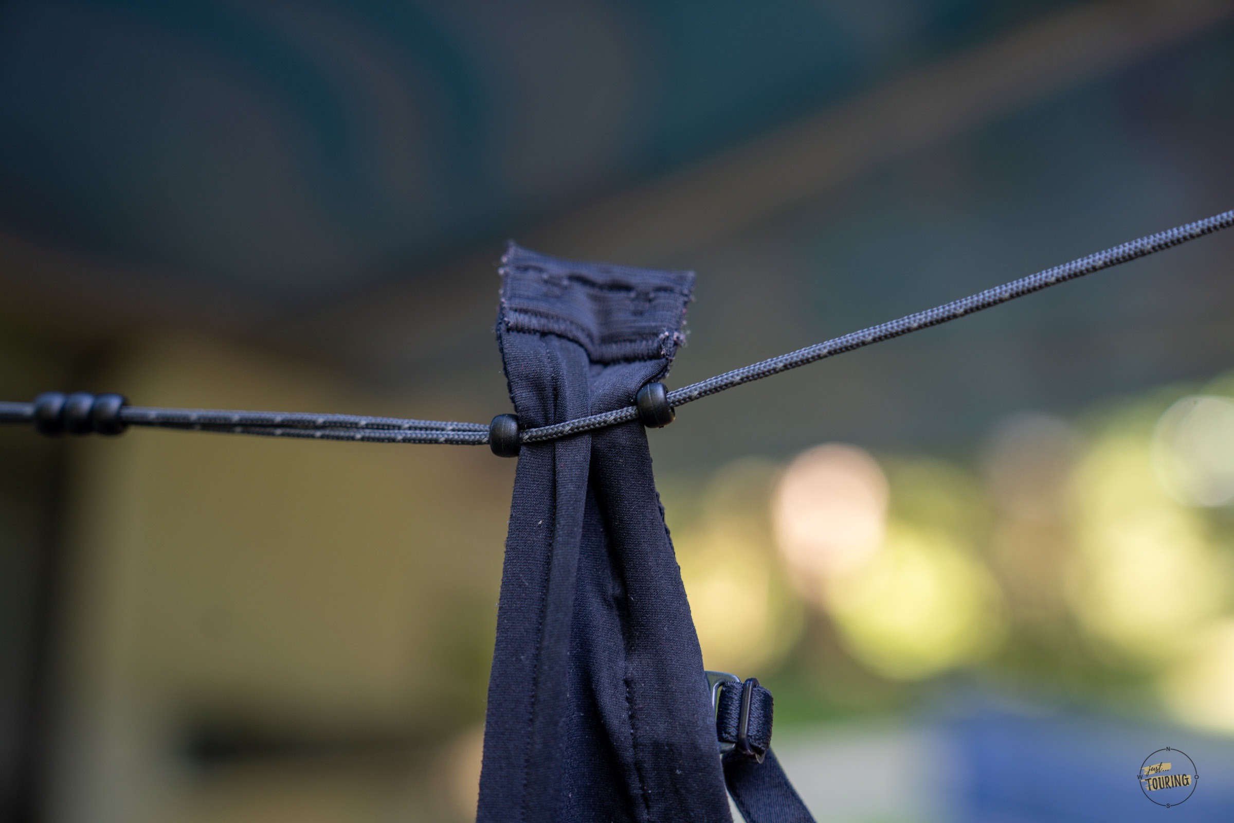 Schnell eine Leine zur Hand zu haben, um mal eben etwas aufzuhรคngen ist sicher eine gute Idee. „Wir haben doch Paracord dabei!“ meinte Markus. Warum haben wir diese Leine dann trotzdem dabei? Sie ist mega klein verpackt, 3,5m lang, leicht und das Beste: Man braucht keine Wรคscheklammern. Dafรผr sind kleine Ringe um die doppelte Leine gezogen und dazwischen kann man einfach die Wรคsche klemmen. Hinzu kommen Haken am Ende der Leine, so dass man sie einfach spannen kann. Kommt immer mit, braucht keinen Platz und hat fast kein Gewicht. Wie sagt man in der Schweiz gerne: Tip top!