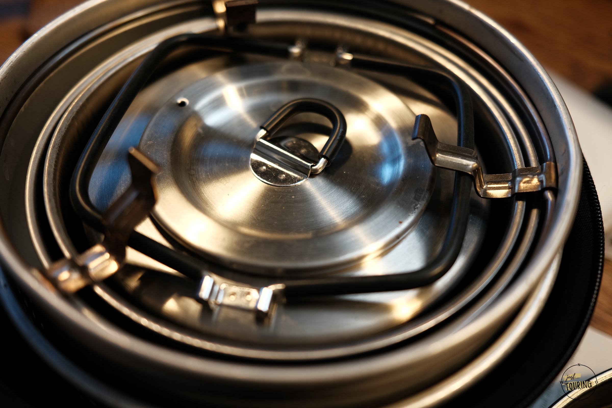 Edelstahl ist feuerfest, läuft innen nicht an und nicht zuletzt ist/soll Alu ja auch nicht gerade gesundheitsfördernd sein. Also recherchiert und schnell auf einen vermeintlich passenden gestoßen. Schöner Kessel, aber leider in der Höhe vermessen. Passt nicht rein bzw. der Deckel vom Trangia passt dann nicht mehr richtig.