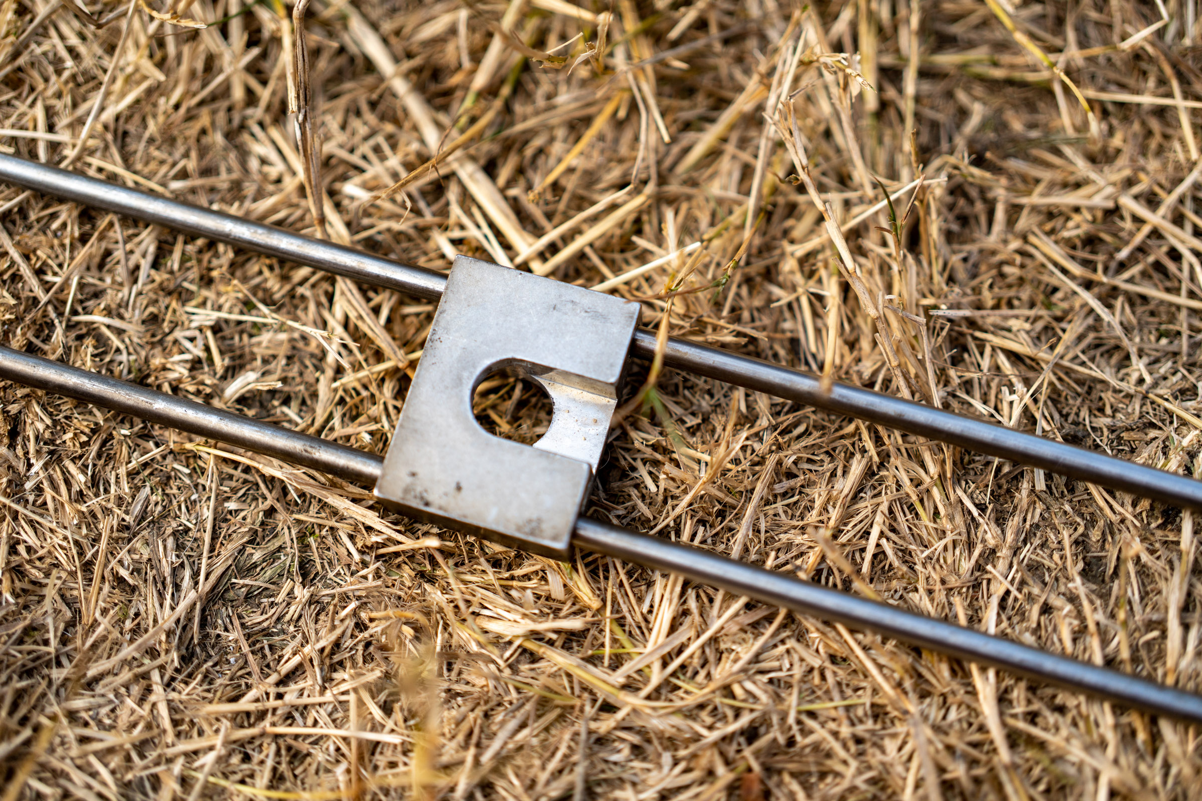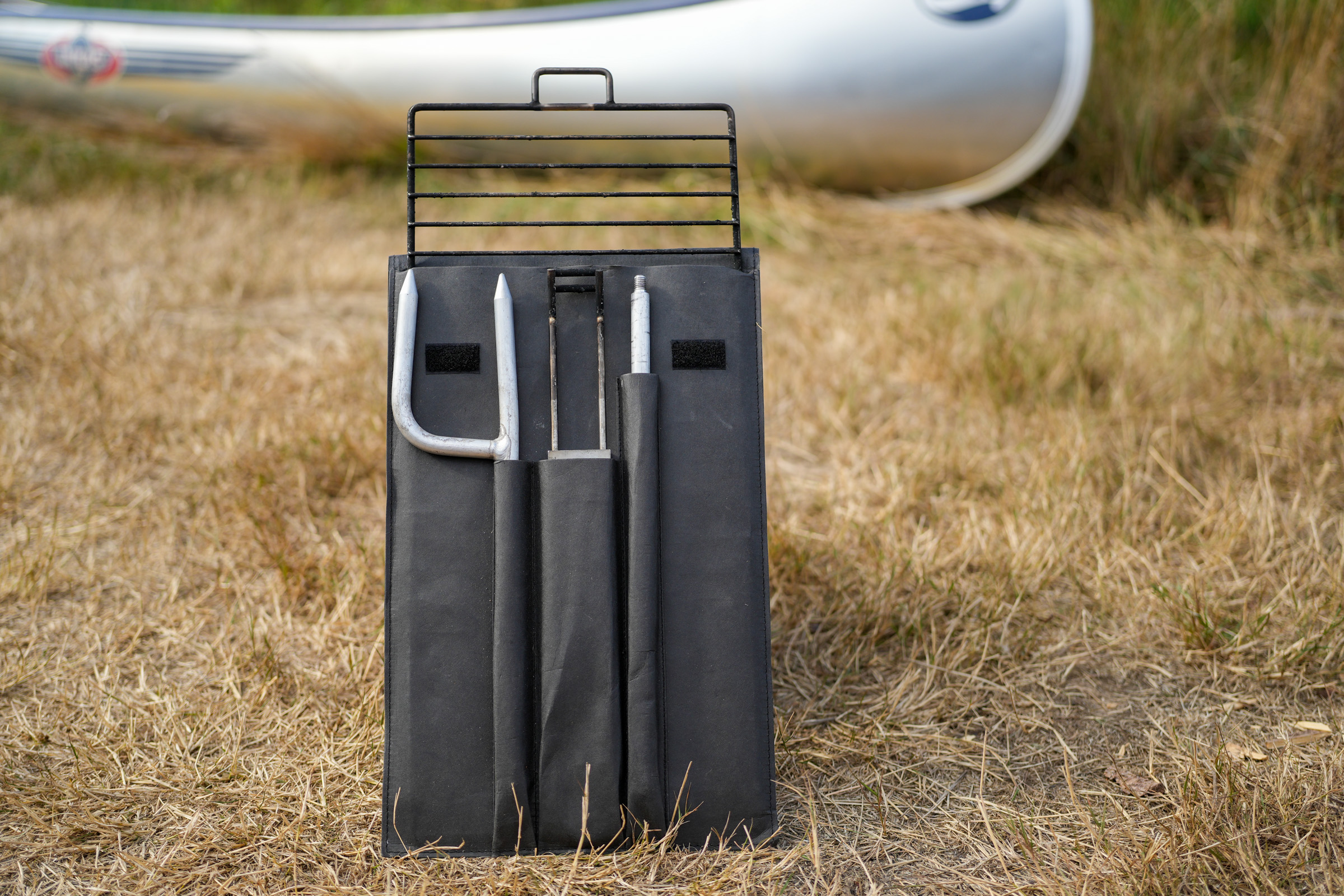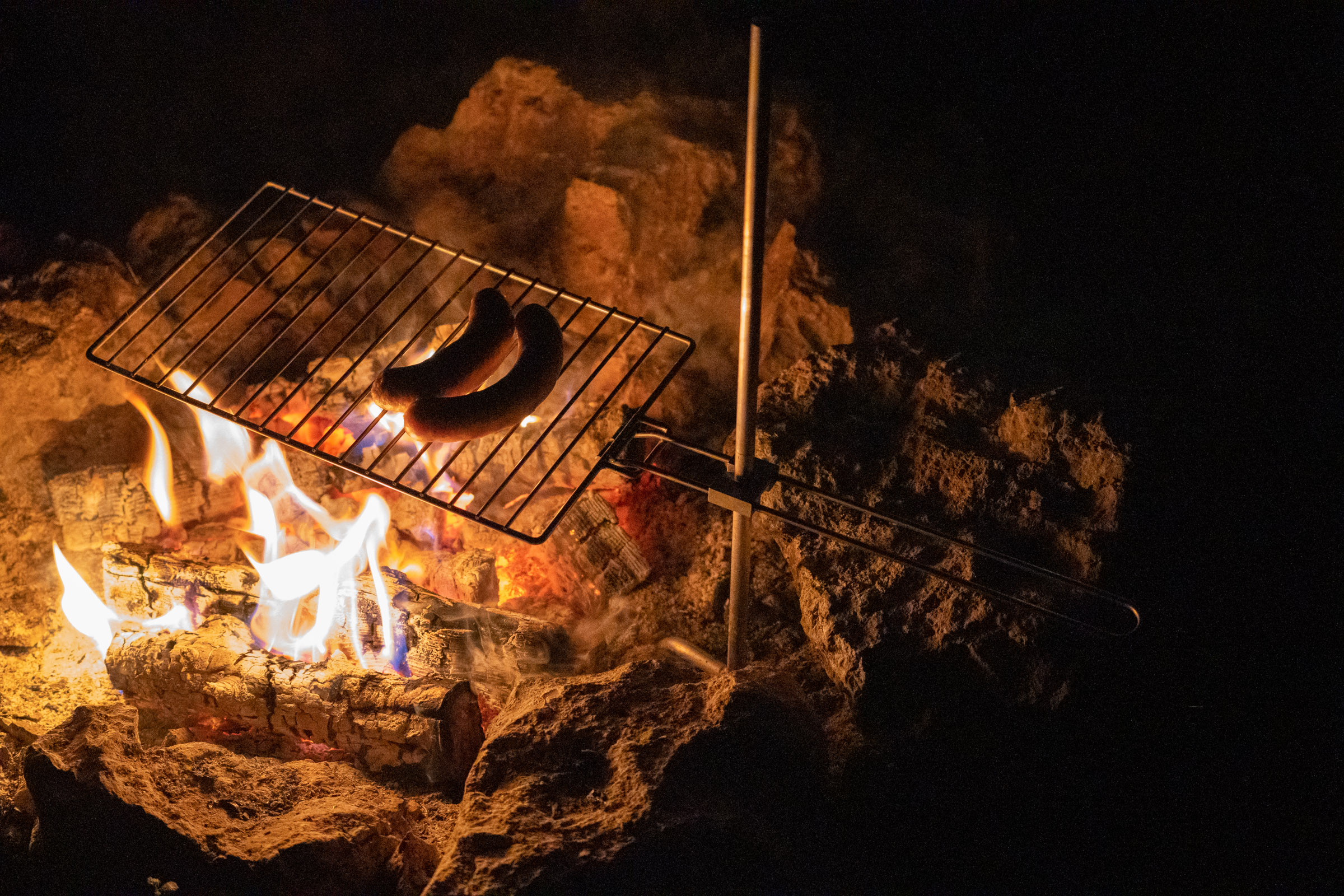 Er hat uns direkt begeistert, weil das Prinzip so einfach wie genial ist. Zwei Stangen werden zu einer groรen zusammengeschraubt und einfach neben dem Feuer in den Boden gesteckt.