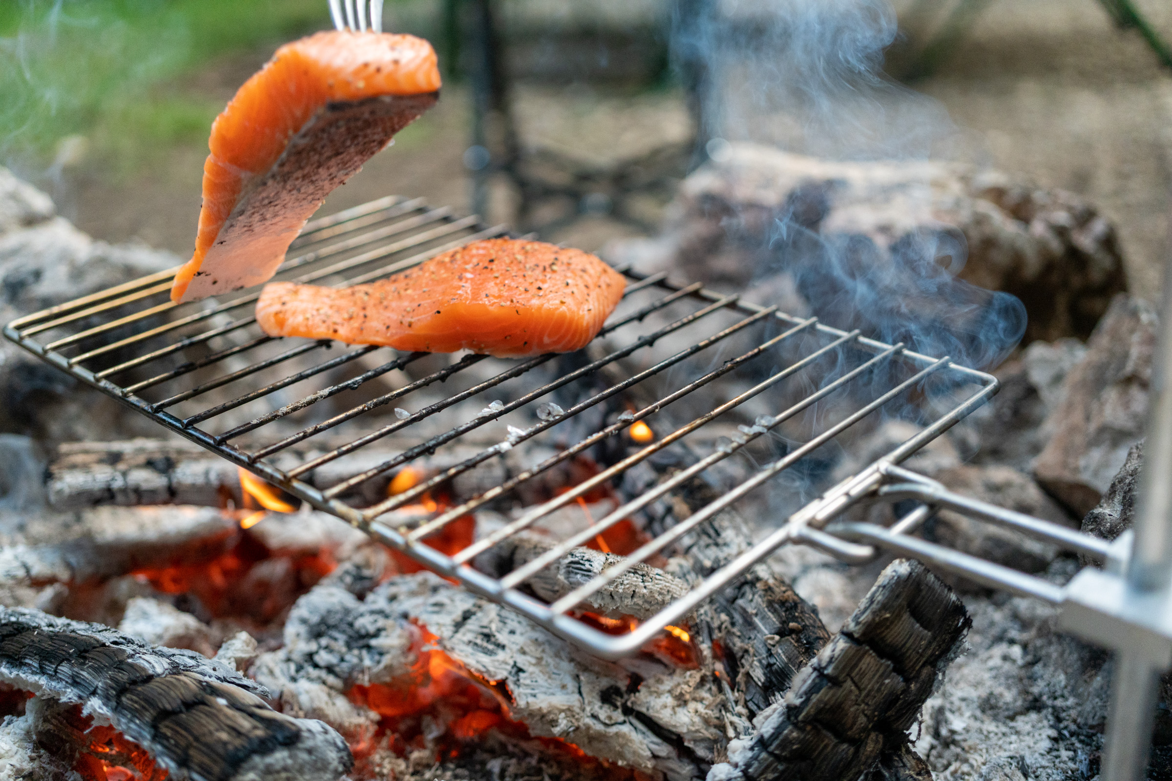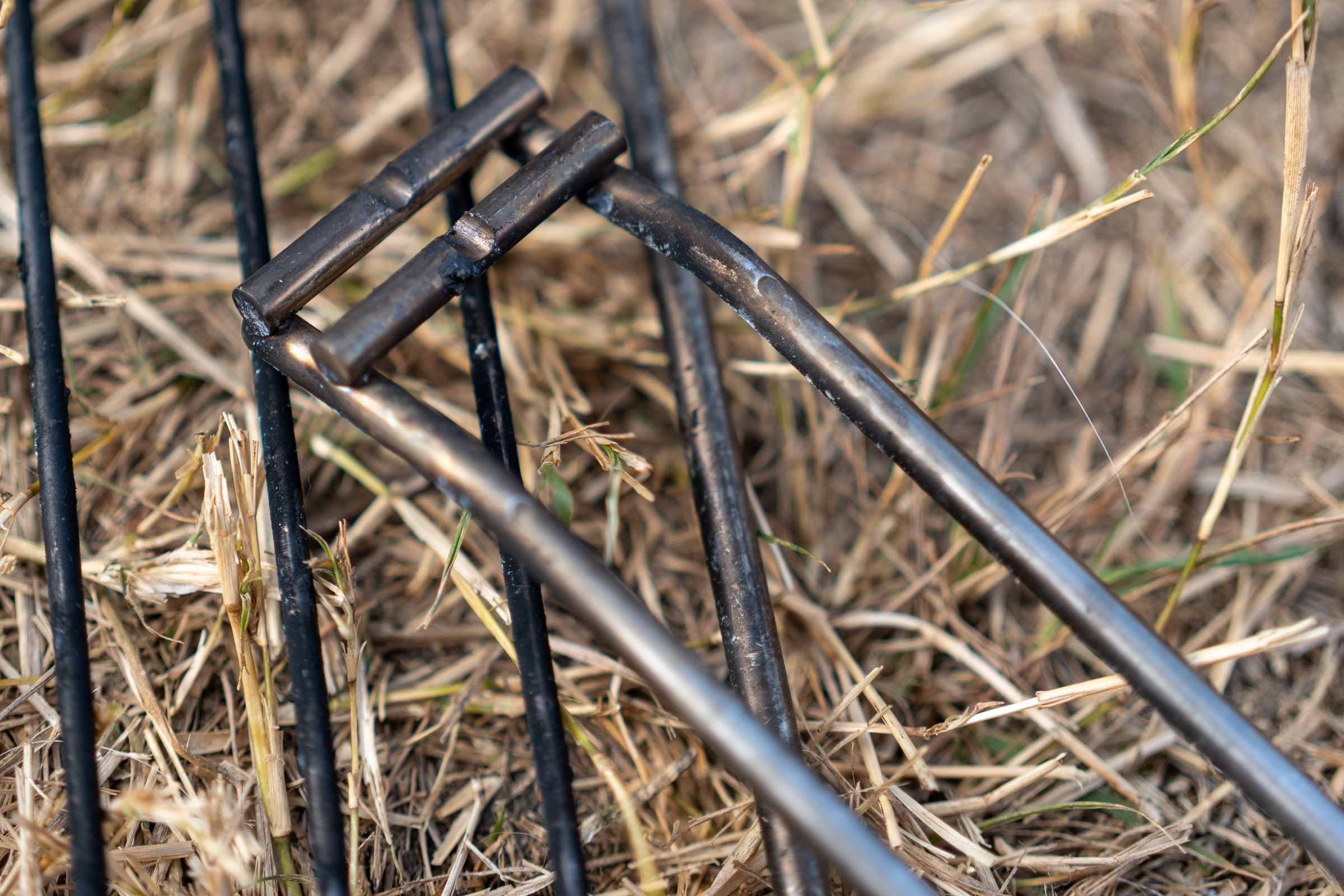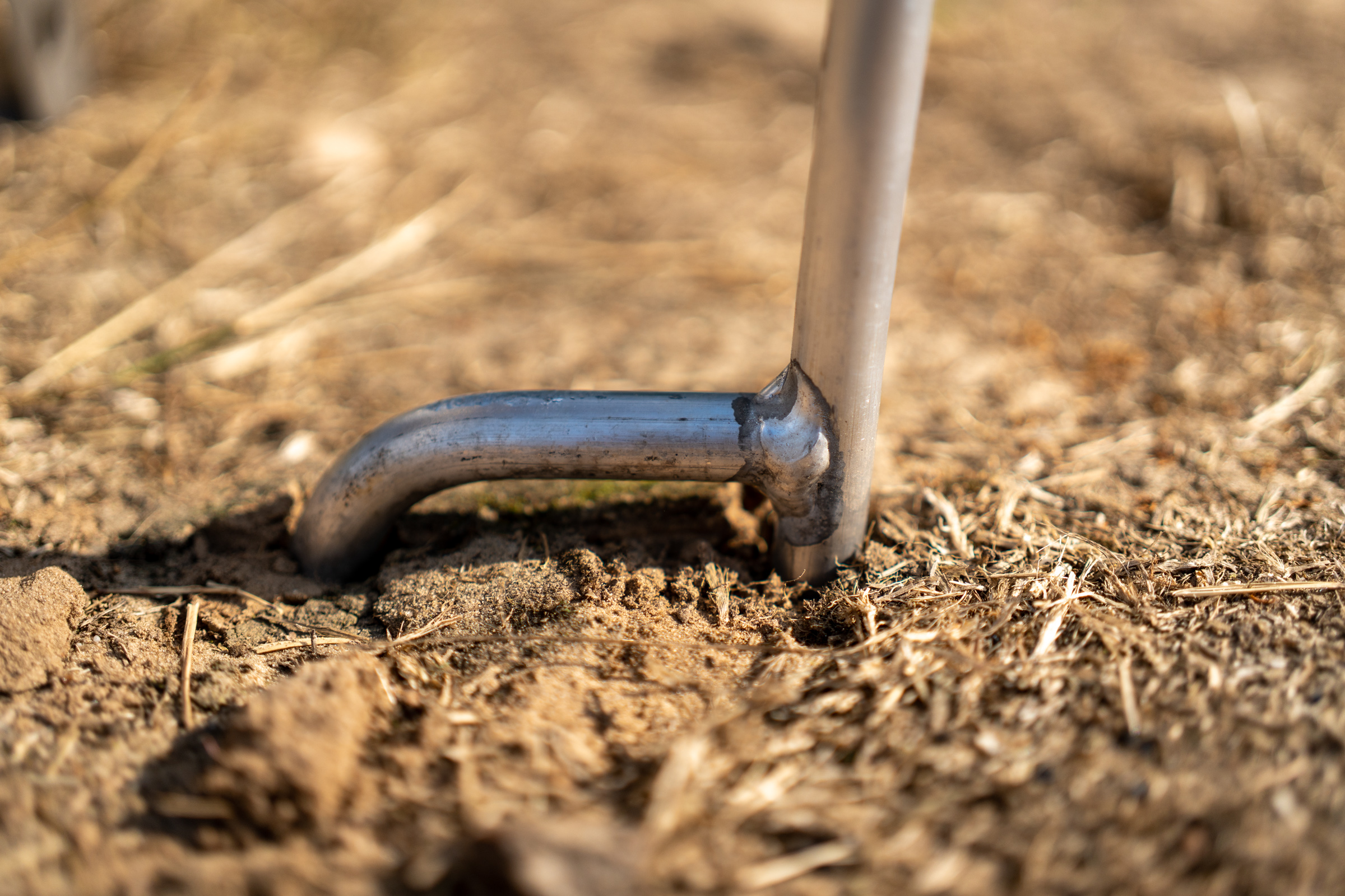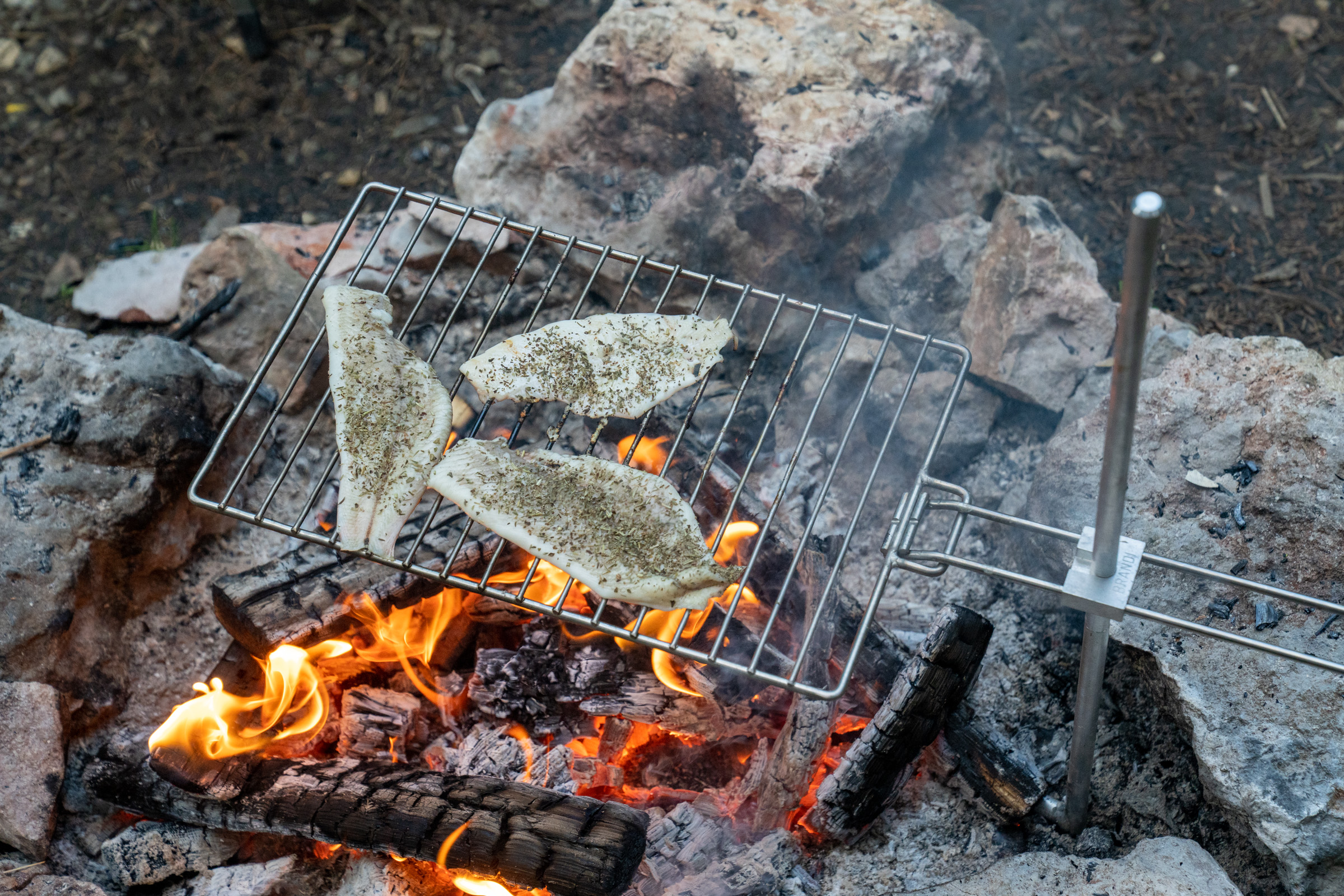 Er hat uns direkt begeistert, weil das Prinzip so einfach wie genial ist. Zwei Stangen werden zu einer groรen zusammengeschraubt und einfach neben dem Feuer in den Boden gesteckt.