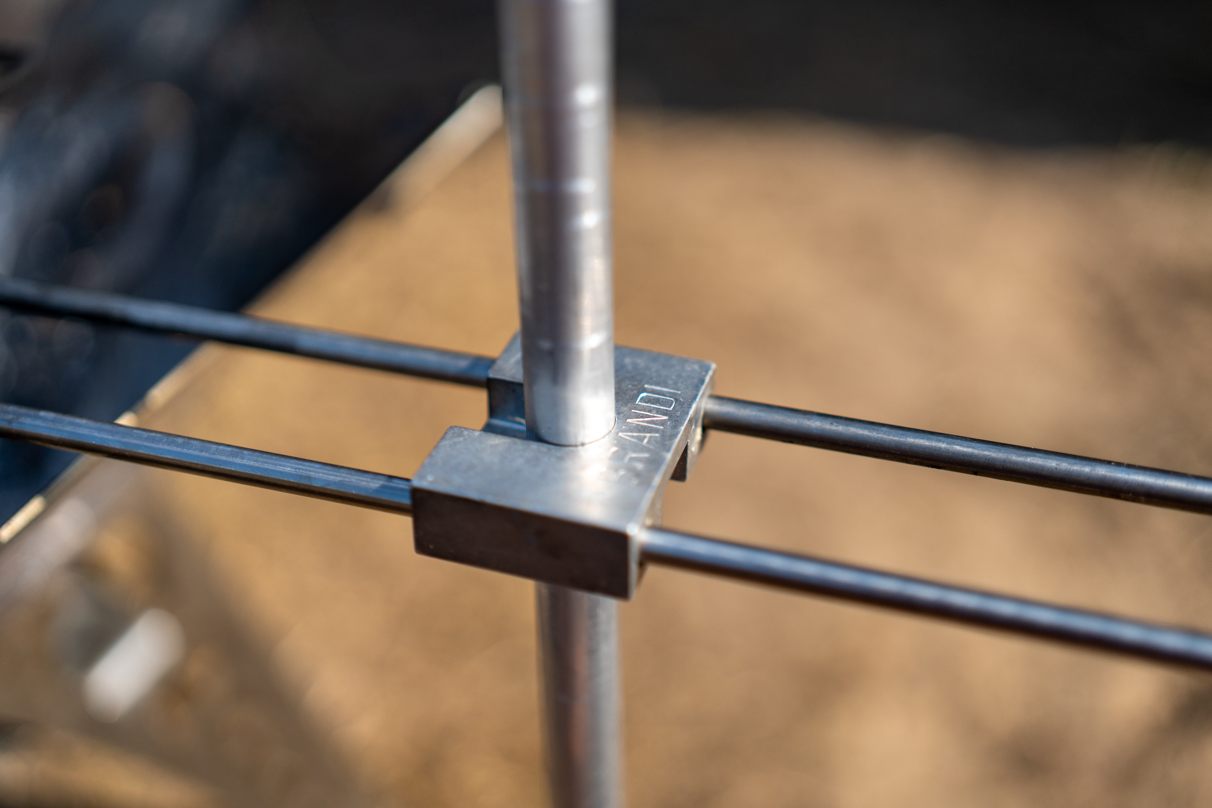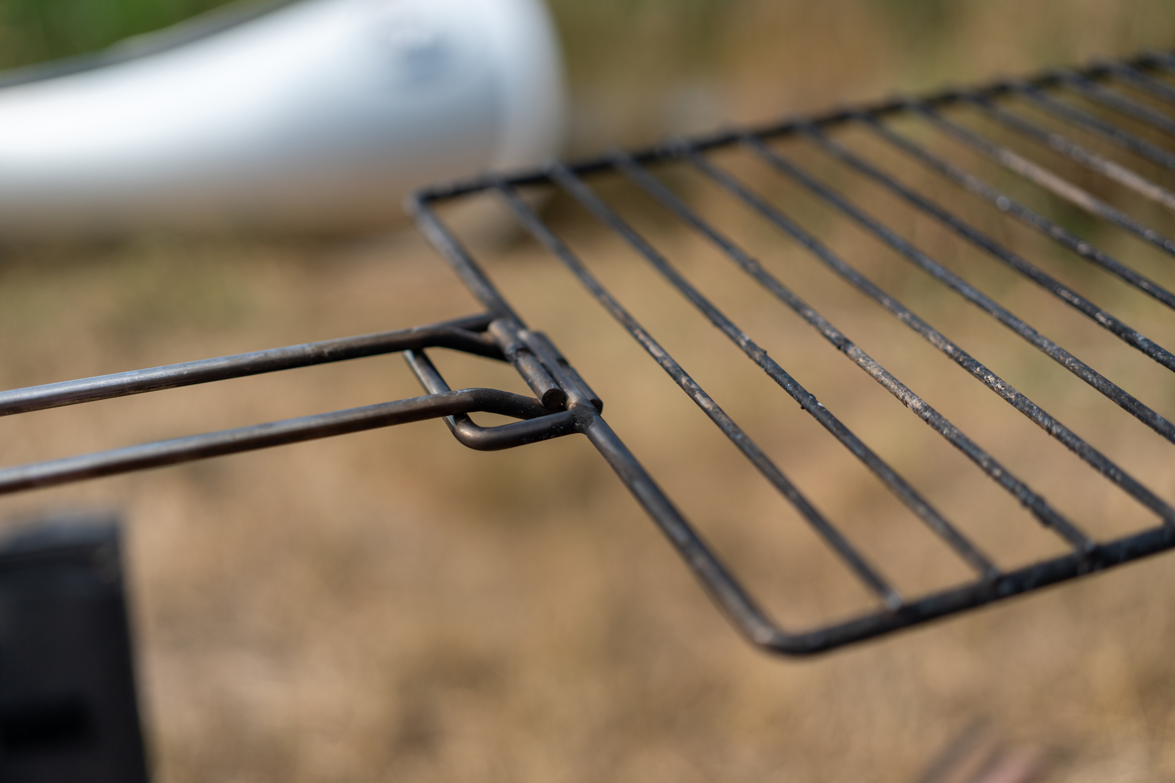 Dann wird in einen Griff ein Rost gehangen – hรคlt via Hebelwirkung – und ย รผber ein Loch im Griff auf die Stange gesteckt. Das Ganze ist stufenlos in Hรถhe und Tiefe verstellbar. Kรถnnt ihr euch nicht vorstellen? Hier kommen die Bilder und im Video seht ihr es auch ganz genau.
