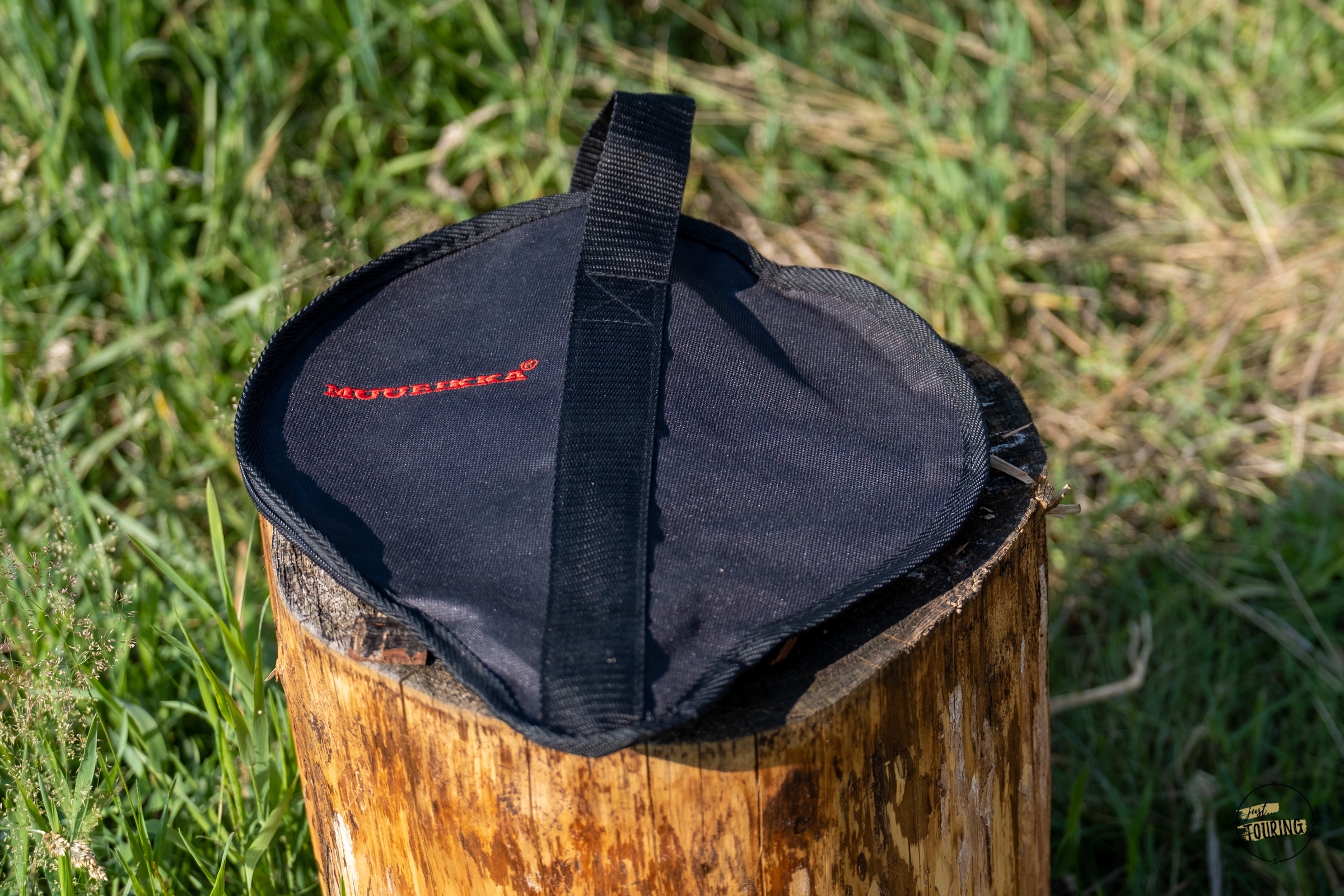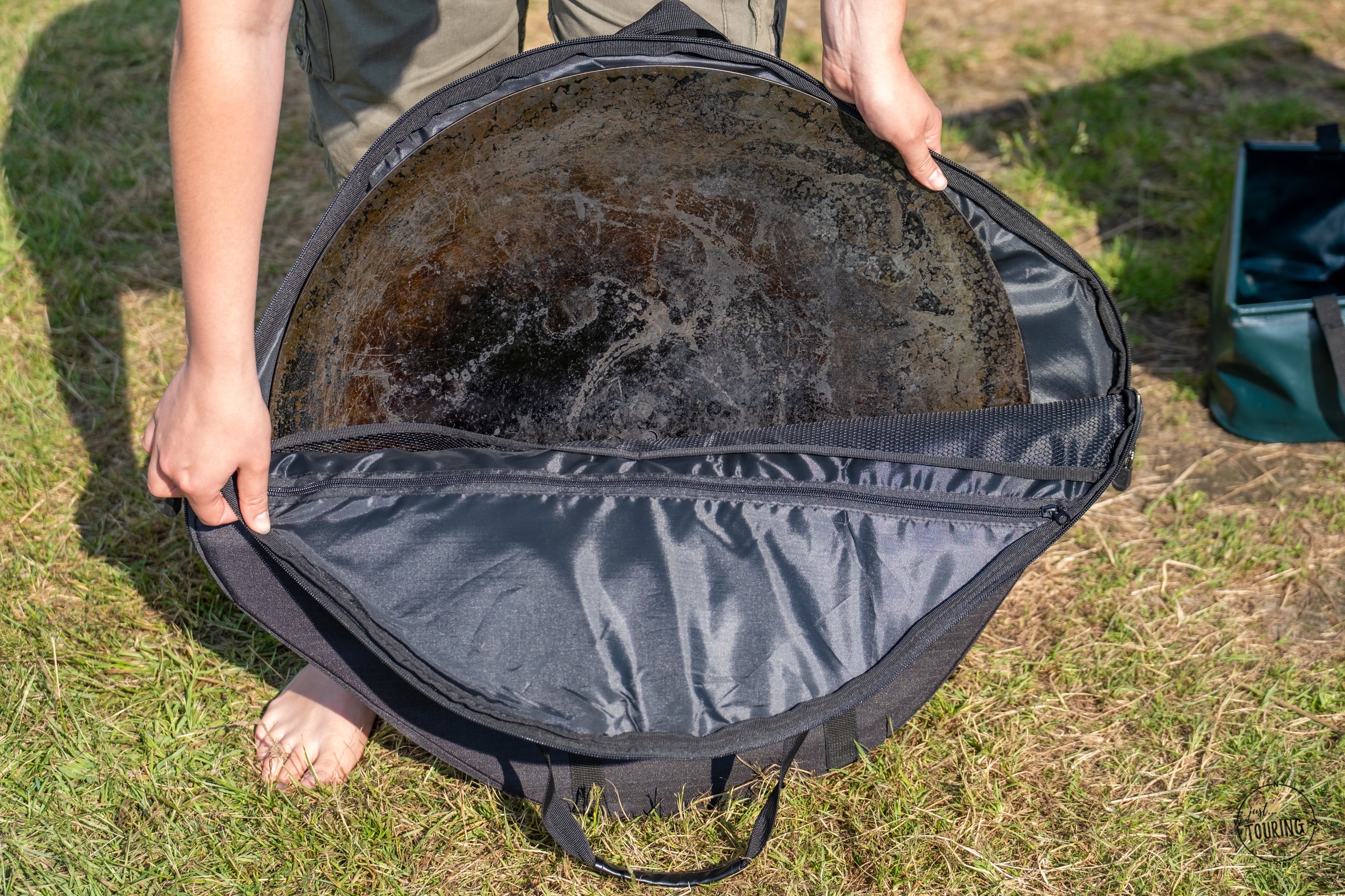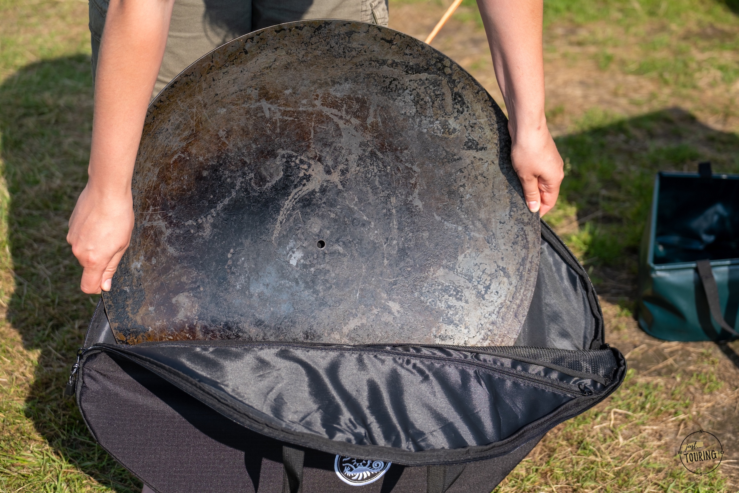Wir haben uns zusätzlich zu der Schale noch die passende Tasche angeschafft. Das hat vor allem den Vorteil des leichteren Transports. Die mehr als 6 kg Stahl können Griffe und einen Schutz gut gebrauchen – natürlich nicht für den Stahl selbst, sondern für die Gegenstände drumherum…