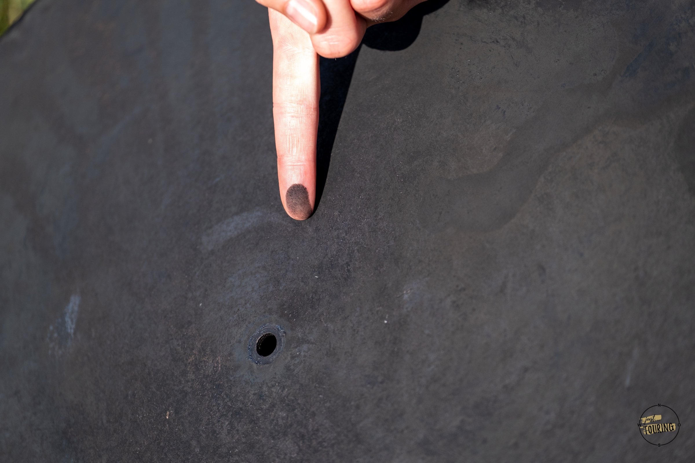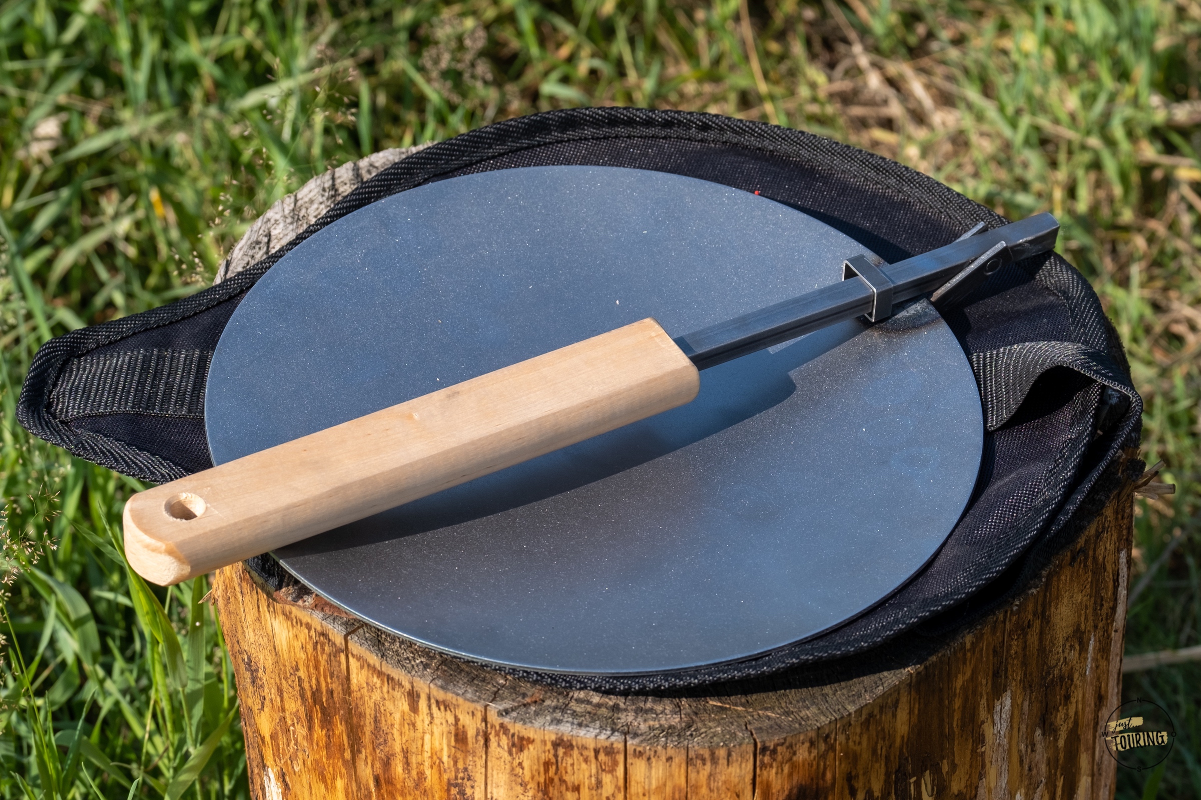 Die Feuerschalen von Muurikka werden direkt ins Lagerfeuer gestellt. Daher kannten wir diese Art von Platten. Es ist vom Prinzip her auch eine leicht konkave Schale, bei der statt der Stange zum Aufhängen, drei Beine unter die Schale geschraubt werden, um sie so direkt ins Feuer zu stellen.