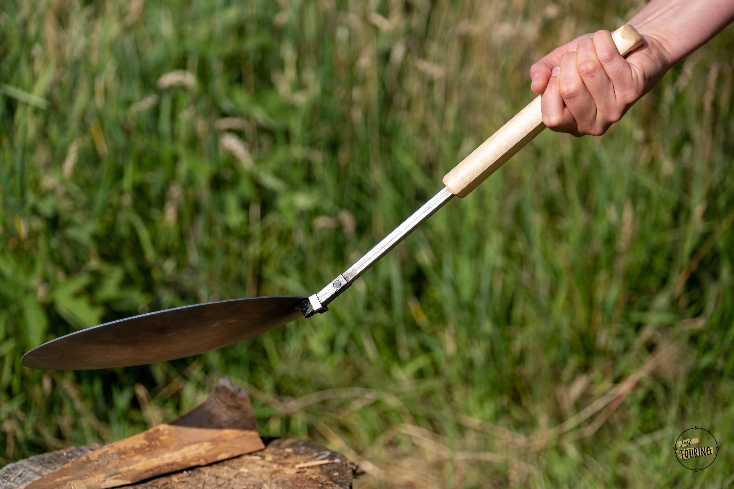 Die Hänge-Feuerschalen gibt es in unterschiedlichen Größen. Unsere Hänge-Feuerschale ist von Petromax und hat einen Durchmesser von ca. 56 cm. Sie wiegt ca. 6,4 kg. In die Mitte der Schale wird ein Stab mit Öse geschraubt, um sie daran aufzuhängen. Gut, ein Leichtgewicht ist sie nicht und auch kein Packmaßwunder. Dafür macht das Kochen in unserer Lagerküche damit großen Spaß! Wir werden sie immer dann mitnehmen, wenn wir wissen, dass ein Feuer möglich ist und wir für längere Zeit unser Lager aufschlagen.
