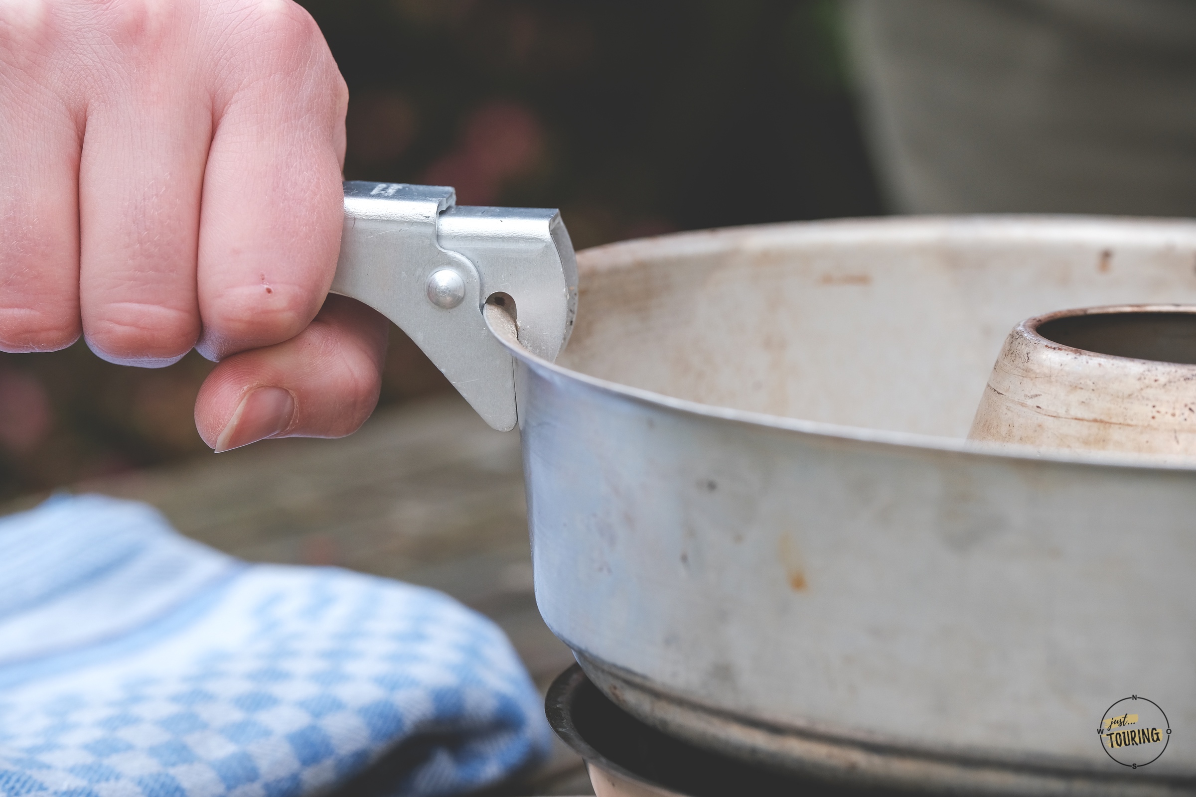 Bei unserem Trangia Sturmkocher war eine Griffzange mit dabei. Damit lassen sich alle Edelstahlteile von unserem Geschirr prima packen und sicher hochheben. Mal eben auf einer Flame etwas aufwärmen oder einen Tee kochen – kein Problem! Funktioniert übrigens auch prima beim Omnia. 🙂