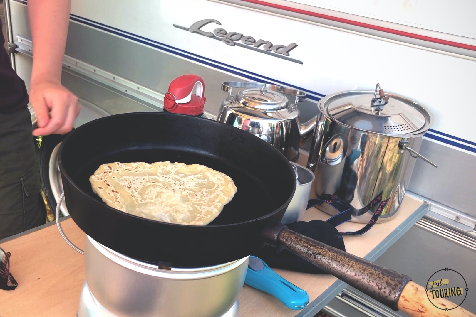 Die Pfannenpizza ist ja mehr ein Flammkuchen. Und den werde ich nach Eurem Rezept bald ausprobieren. Daheim. Nicht unterwegs. Da schon die vegetarischen Frikkas Sucht erzeugen, bin ich auf den Flammkuchen gespannt. Es geht ja nix über schnörkellose Gerichte. Wenige gute Zutaten und einfache Handhabung, das ist genau meins. Kürzlich fand ich im Internet ein KeksRezept für „Gänsefüßchen“ von „Olga kocht“. Simpel und lecker. Wäre vielleicht auch was für Euch. Lieber Gruß aus Essen an die Hunte, bleibt gesund, Eure Nichtcamperin Ullige