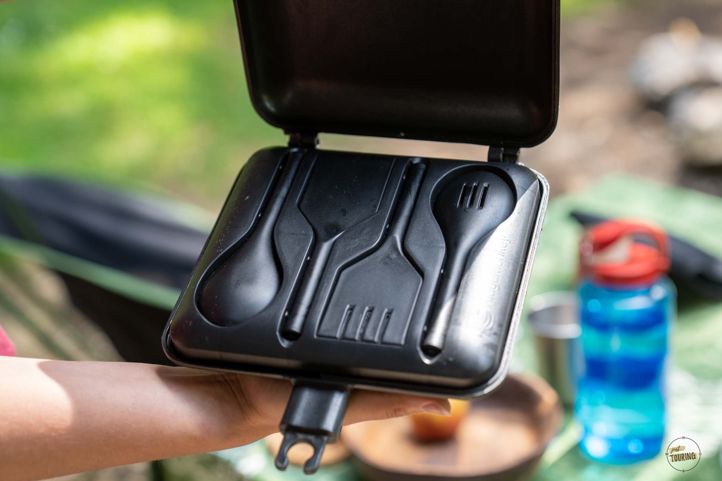 Sobald man ihn nicht mehr braucht, klippt man die Griffe ab und packt sie in den RidgeMonkey. Dazu gibt es ein „Inlett“. Mit dabei sind noch Schaber, Lรถffel und Co. – das nutzen wir eher nicht. Wir haben das Innenteil nur zur Aufbewahrung der Griffe dabei, das ist echt praktisch.