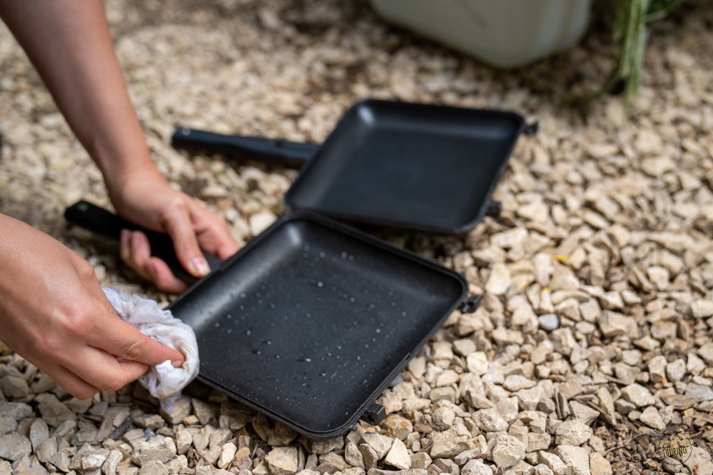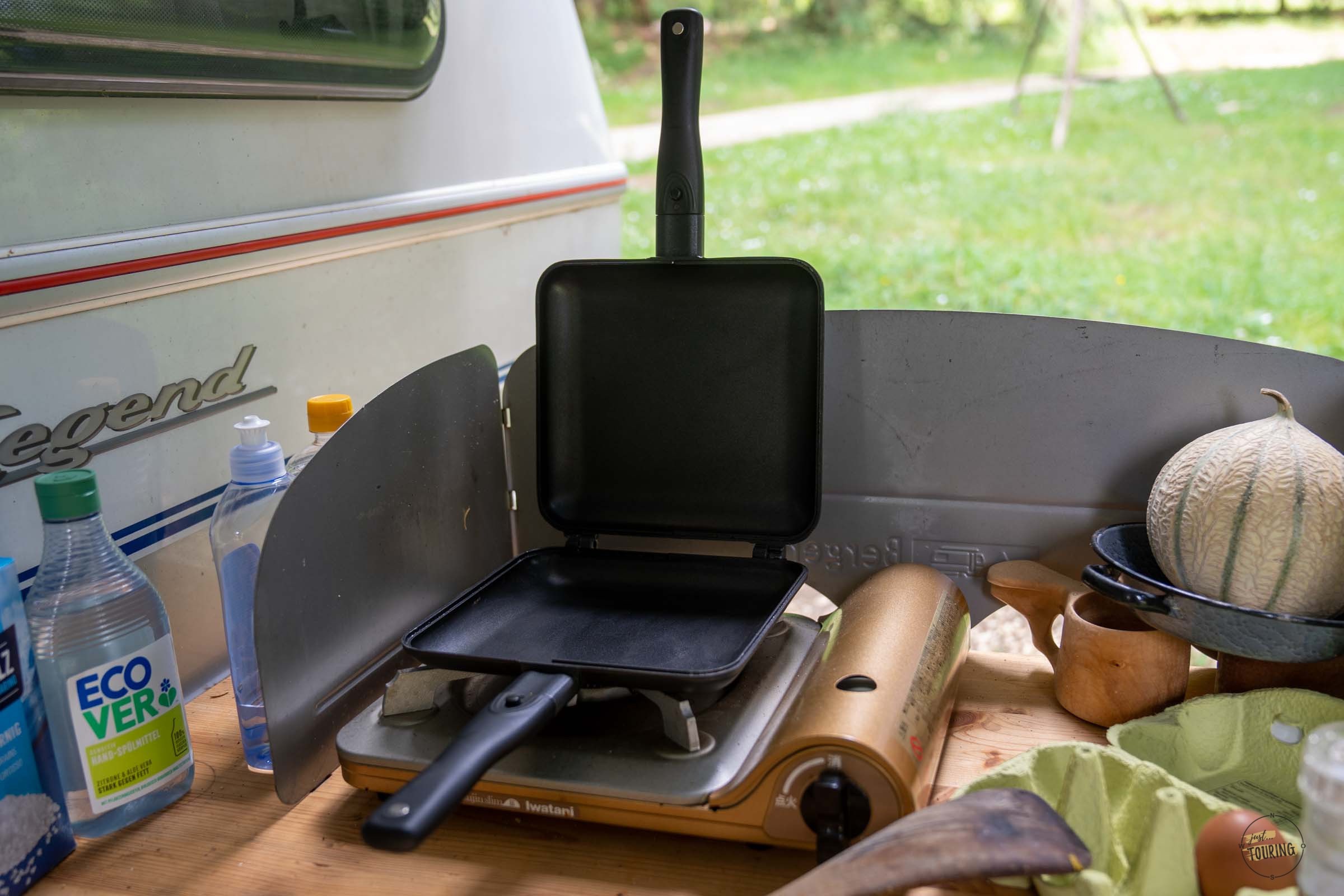 Das Schรถne: Er ist klein, leicht und durch eine Beschichtung innen leicht zu reinigen. Im Grunde sind es zwei beschichtete Pfannen aus Aluminium, die รผber ein Scharnier hinten auf- und zugeklappt werden kรถnnen. Dadurch entsteht auf dem Gaskocher schnell eine gute Hitze und der Inhalt (Pizza oder Sandwich etc.) kann leicht gewendet werden: einfach immer wieder rumdrehen. รbrigens, wenn wir im Wohnwagen kochen, dann riecht es dank der zwei geschlossenen Pfannen so gut wie gar nicht. Das ist gerade bei schlechtem Wetter echt praktisch! ๐